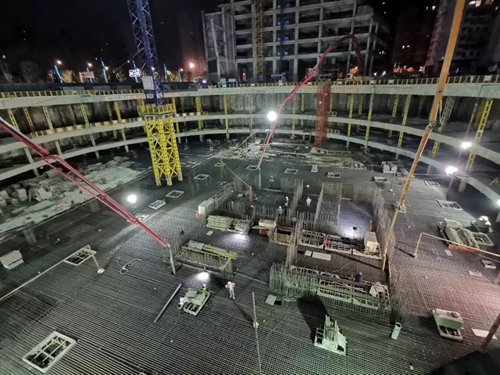 2019年5月5日凌晨一點(diǎn),武漢建工總承包建設(shè)的武漢市軌道交通七號(hào)線一期三陽路風(fēng)塔配套綜合開發(fā)項(xiàng)目二期工程開始了11000立方米大體積混凝土澆筑施工作業(yè),預(yù)計(jì)四天完工。